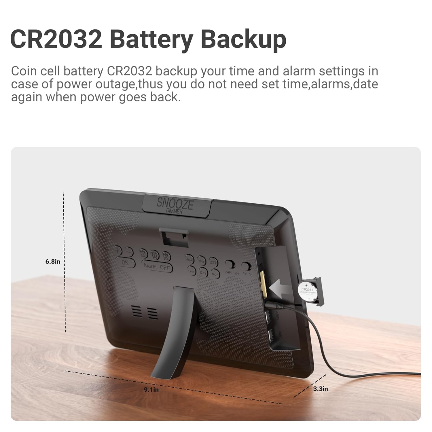- Easy to Set: This digital calendar wall clock for seniors is very easy to set. Just one touch can change to DST&12/24H time format. 2 USB ports can charge your phone and other electronic devices. And this alarm clock only supports power cord use. The built-in backup CR2032 coin-cell battery can backup time and settings in a power surge or blackout(Please remove the plastic tab in the battery compartment before use)