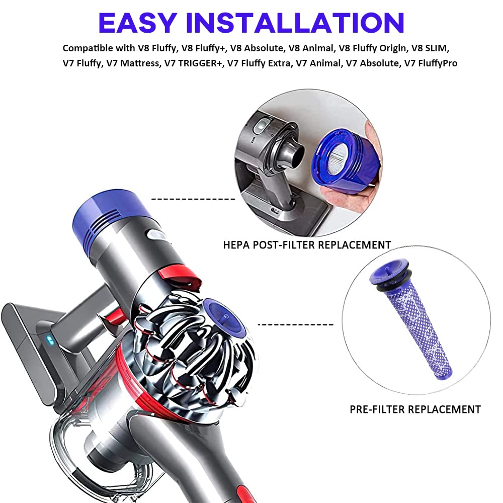 - Quality Filter Set for Your Dyson: Compatible with Dyson V8+, V8 Absolute, V8 Animal, V8 Carbon Fiber, V7 Absolute, V7 Animal Pro, V7 Animal Plus, V7 Motorhead, V7 Car + Boat, V7 Trigger. This set work as great as the original ones and perfect fit in your cordless Dyson vacuums