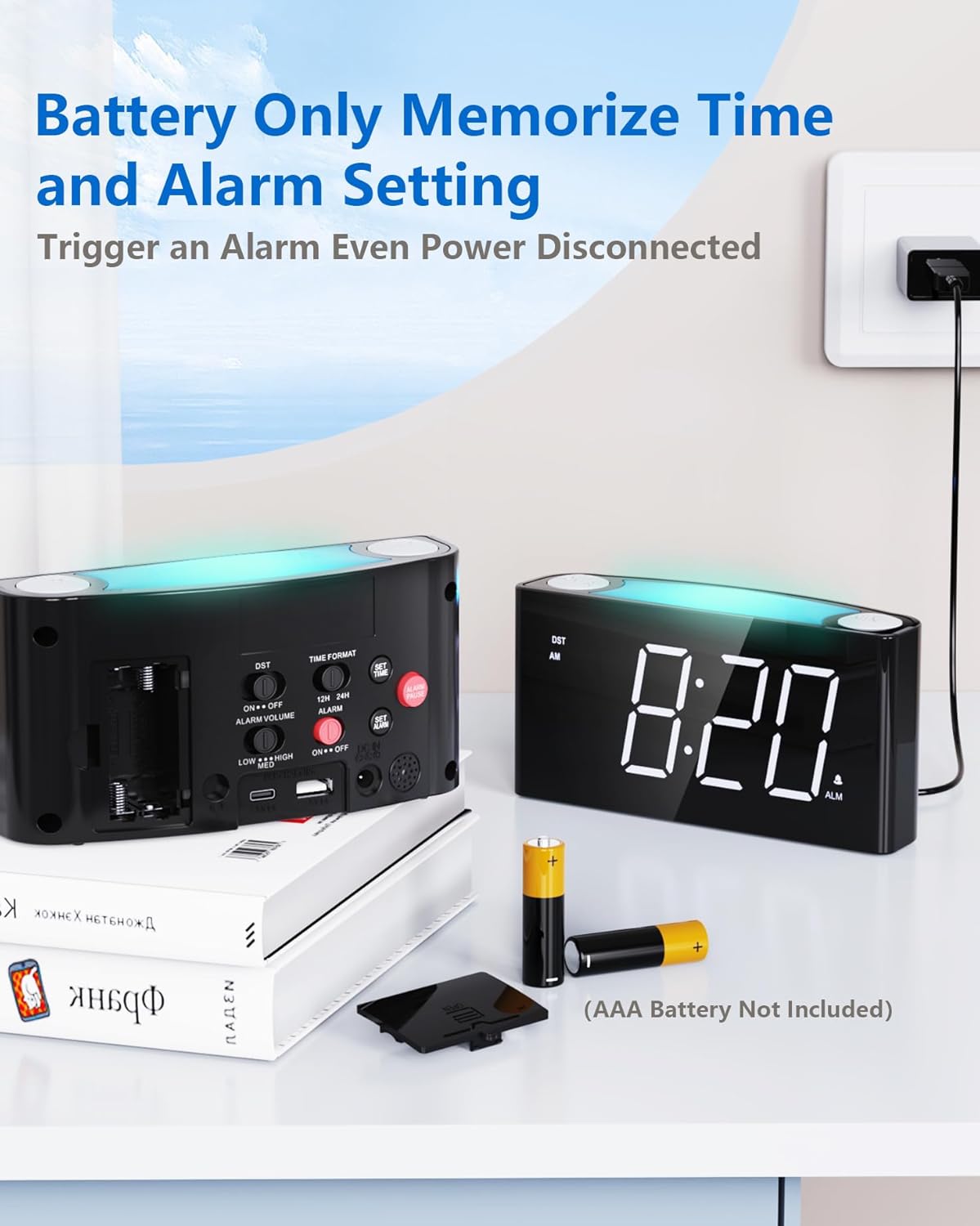 - 【Adjstable Volume & Big Snooze】-This alarm clock for bedroom is desinged with 3 levels volume(90db-103db-110db).Heavey sleepers can be waken up easily with the loudest alarm volume. Instead of obnoxious harsing sounds,the buzzer sound is very soothing.It starts slower and softer and then increases gradually until it reaches its maximum.Waking up more gently! With big snooze button on the top, you can pause the alarm very quickly without opening your eyes and enjoy extra 9 minutes’ sleep