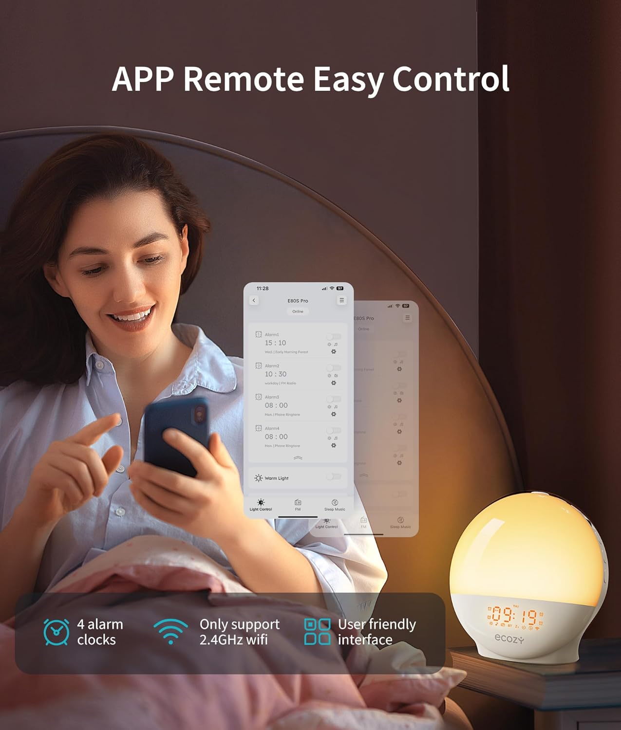 - Smart APP and Voice Control: Connect the wake-up light alarm clock to WiFi (2.4 GHz) and control it remotely via the EcozyHome APP. Set up to four alarms easily, with a simpler, time-saving interface. It also supports Amazon Alexa for voice control