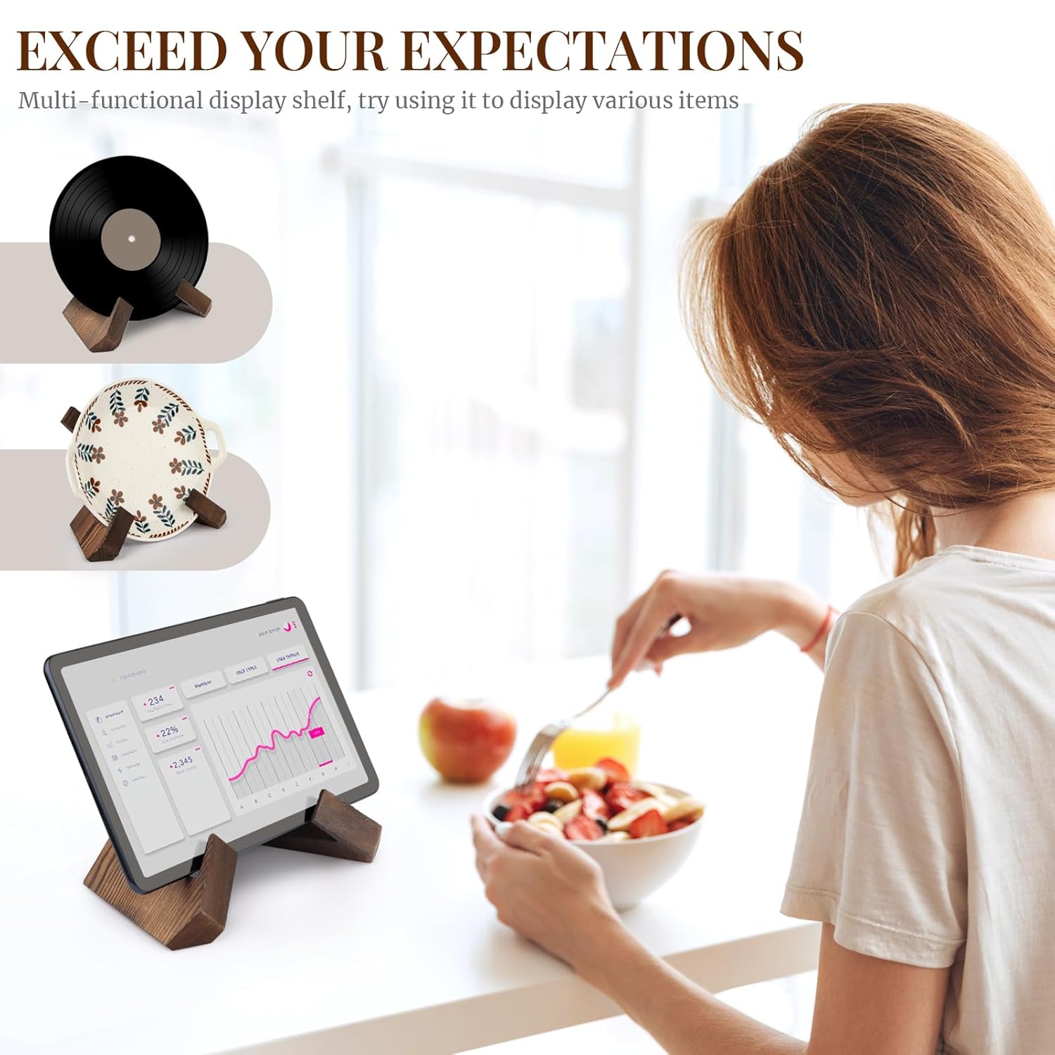 This stand looks great and goes well with my kitchen. I use it to hold my recipe book. I chose this stand over others because I am able to fold it down and put it away in a drawer or cupboard when not in use.