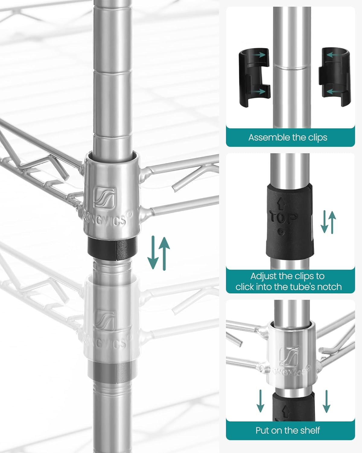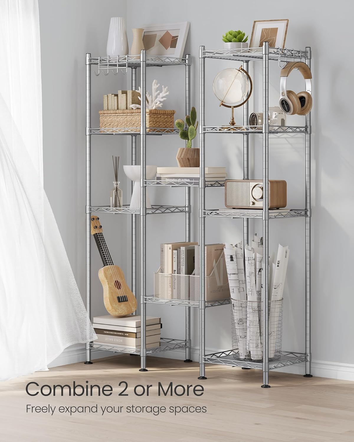 - [Adjustable Height, Extendable Design] Each shelf is height-adjustable to help maximize the space. Also, you can extend the rack infinitely with more metal shelves—at least until it reaches the limits of your walls